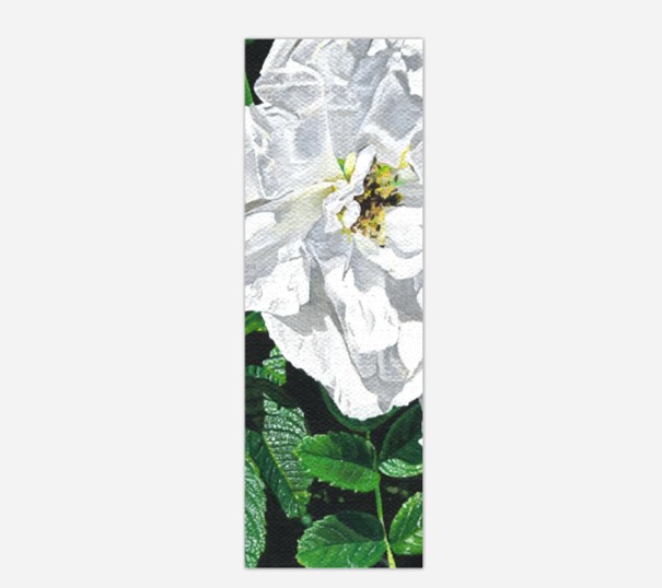 The original painting is an acrylic miniature. I enjoyed painting the rose leaves so much it sparked a series of Rosa Alba paintings. The flowers are common throughout eastern Canada.