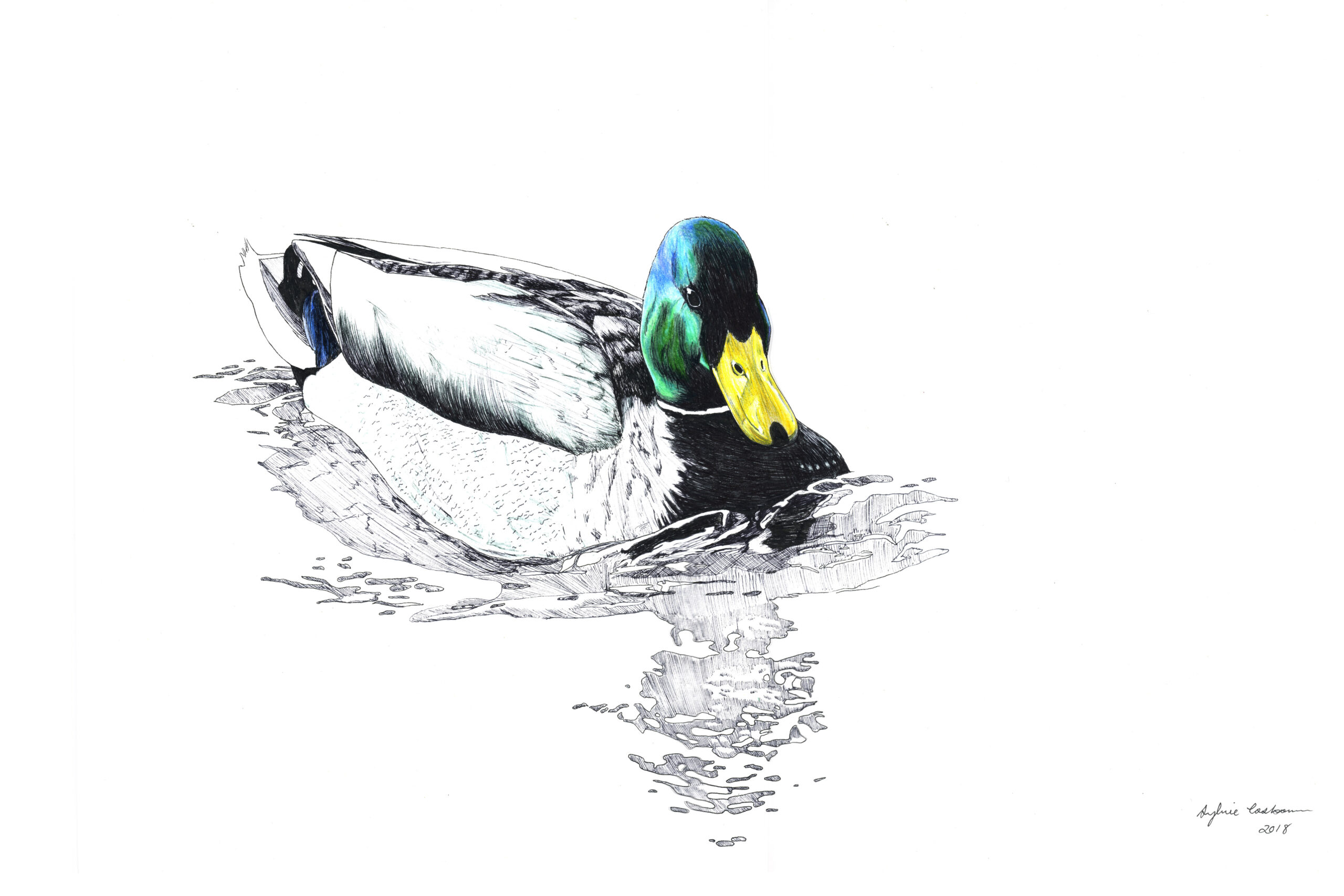When looking for reference images for this avian portraits series I wanted bird species that have some bright colouring in their plumage.  Although mallard ducks are often overlooked as such a common species, they do have quite striking colouring, especially the males.  The bright orange feet, yellow bill and iridescent green head make them the perfect artistic subjects.  I also enjoyed the water reflection in this particular image.  Read more about this series on the about page.