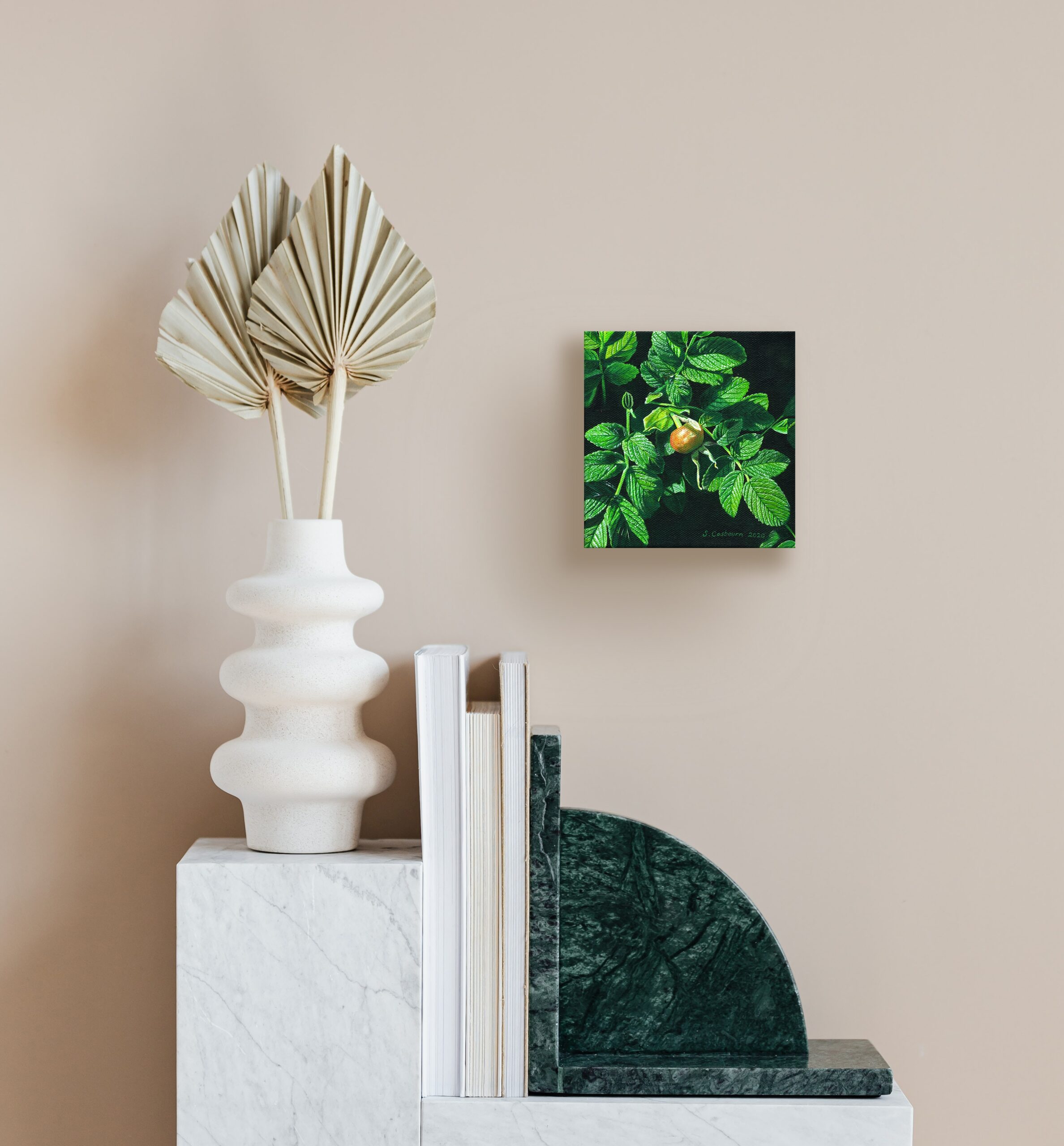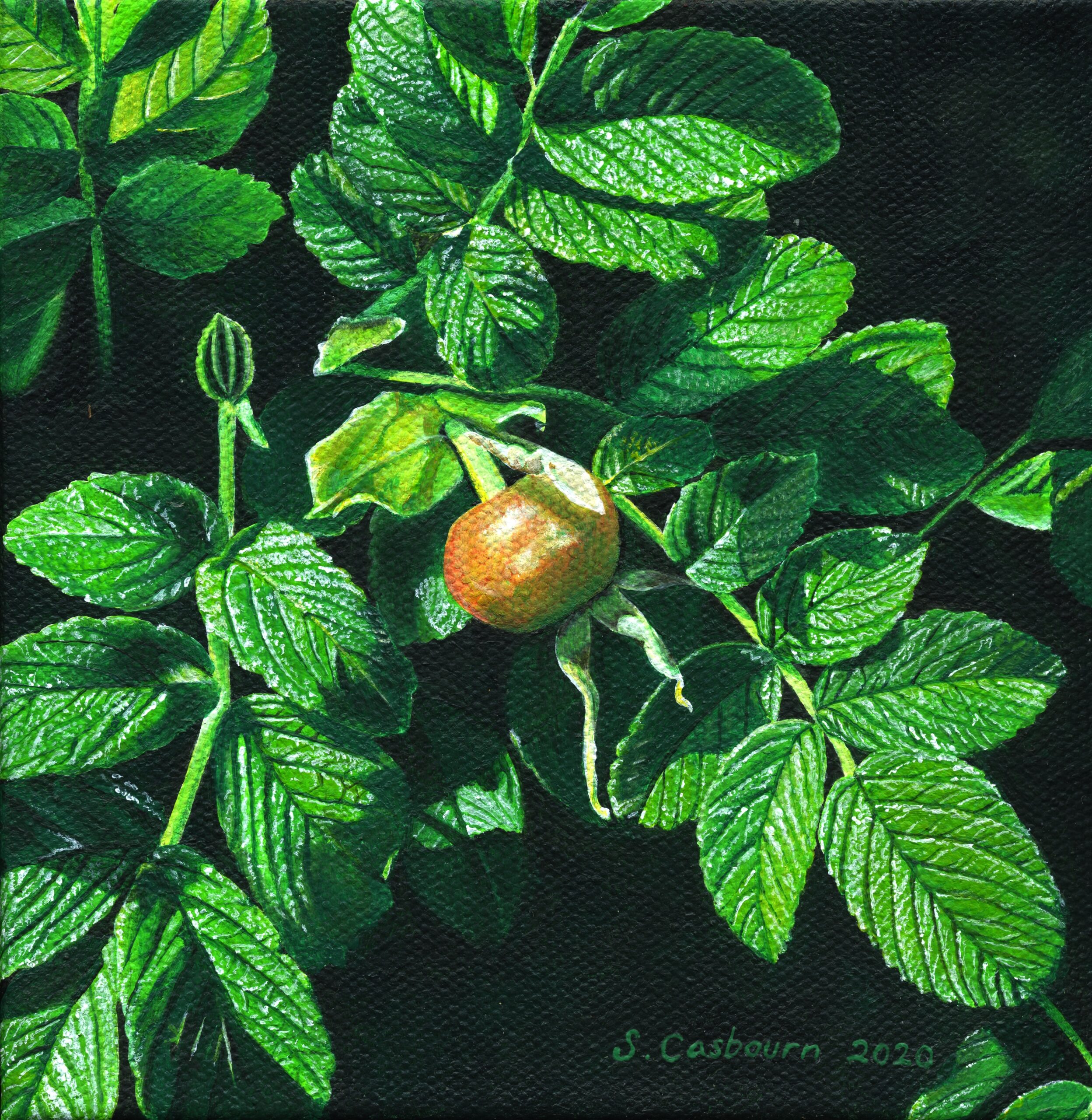 I enjoyed painting the leaves so much in my rosa alba series that I decided to do a miniature featuring just leaves and a lone rosehip. I have a two more rosehip paintings in progress.
