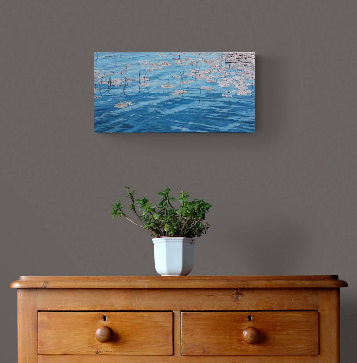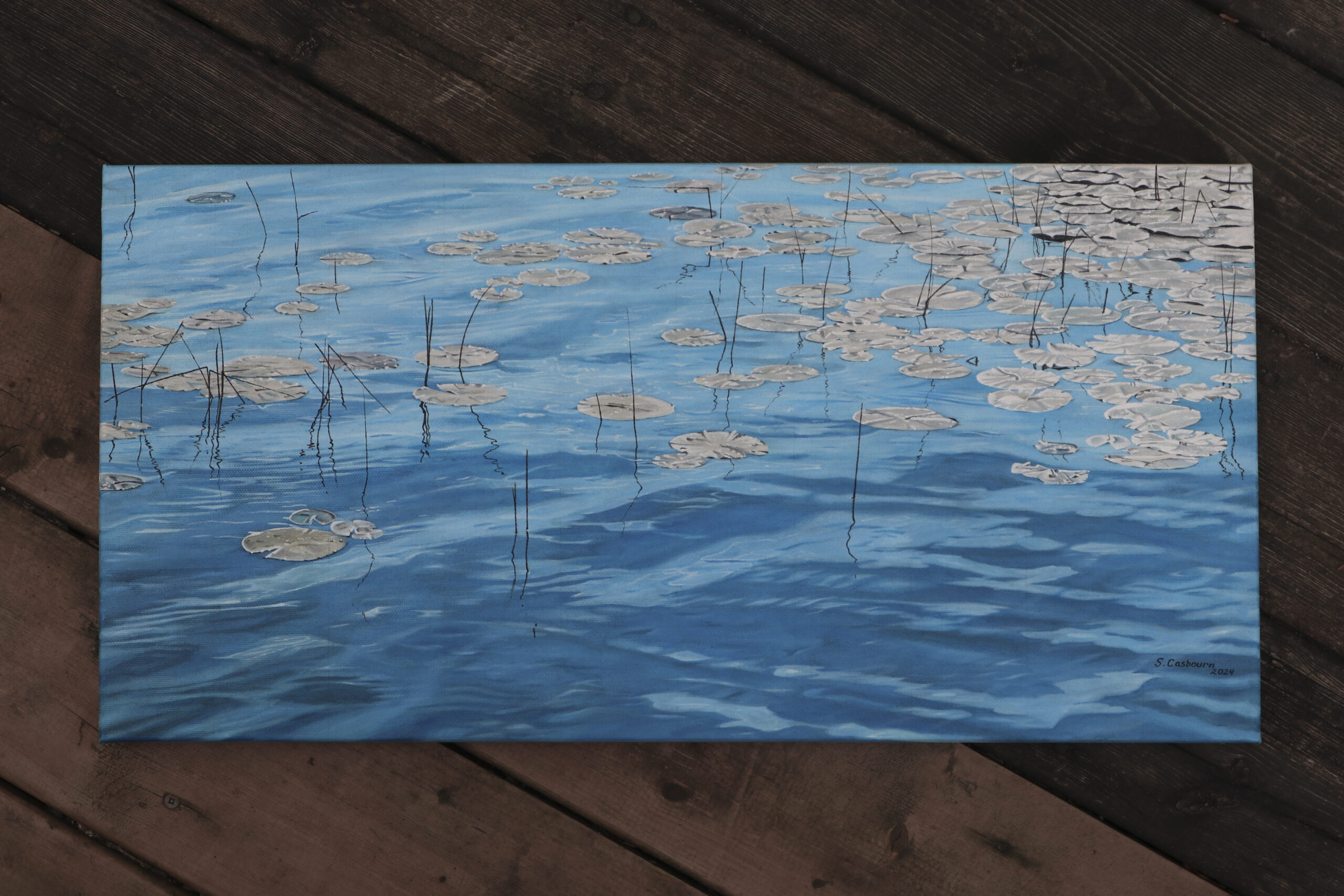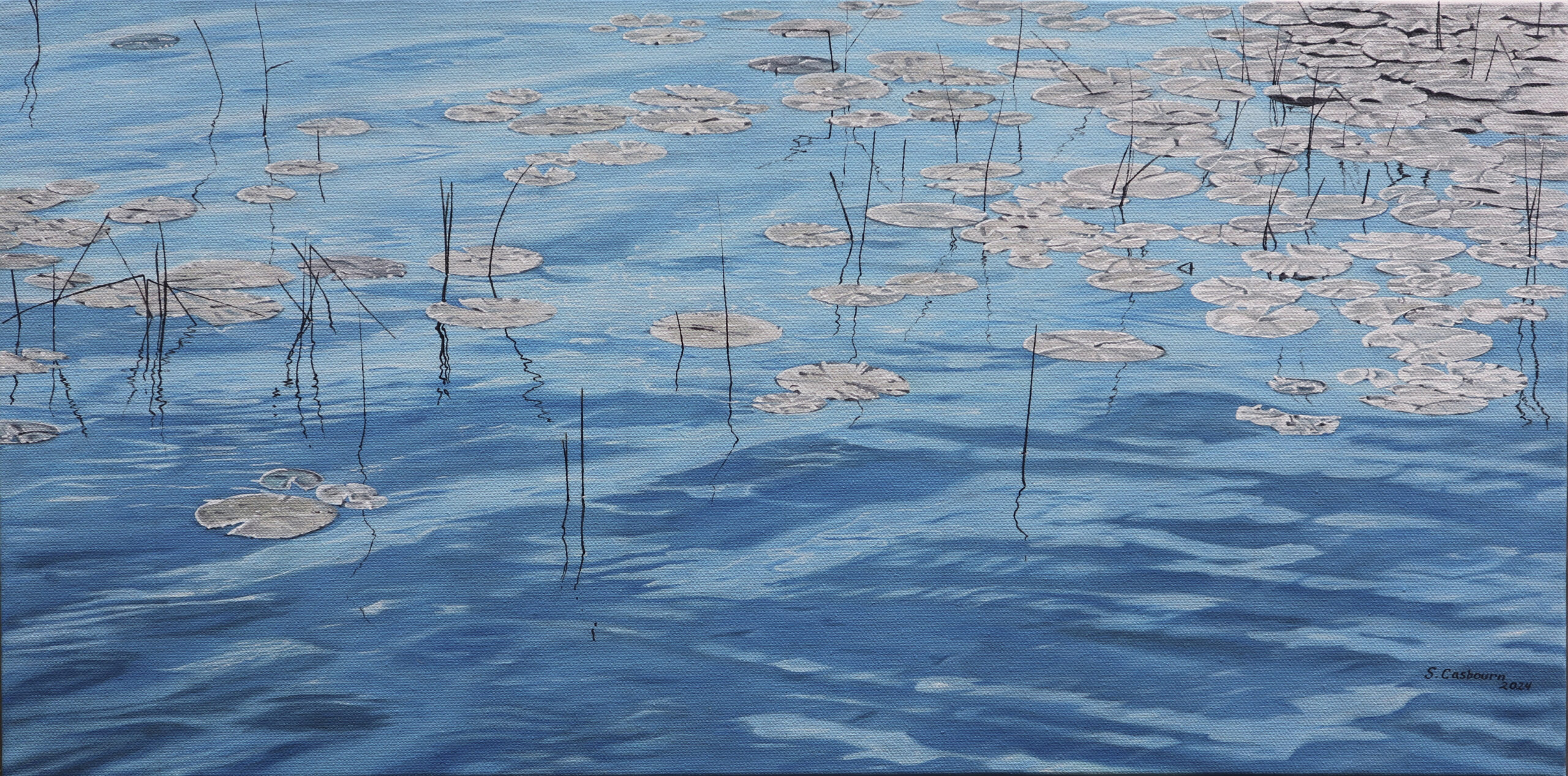 Part of a collection based on a photograph I took near the Bruce Peninsula. The sunlight dazzling on the water turned the lily pads from green to silver grey.