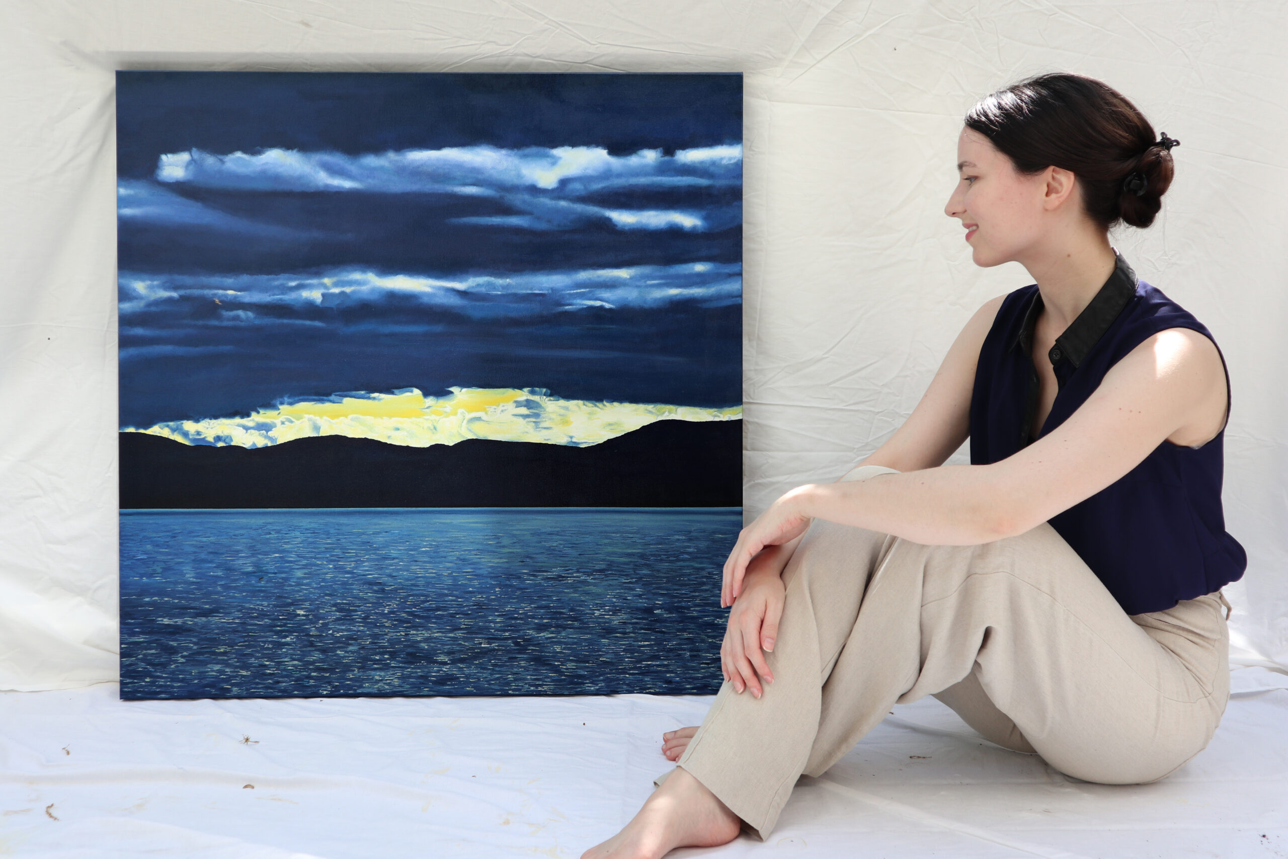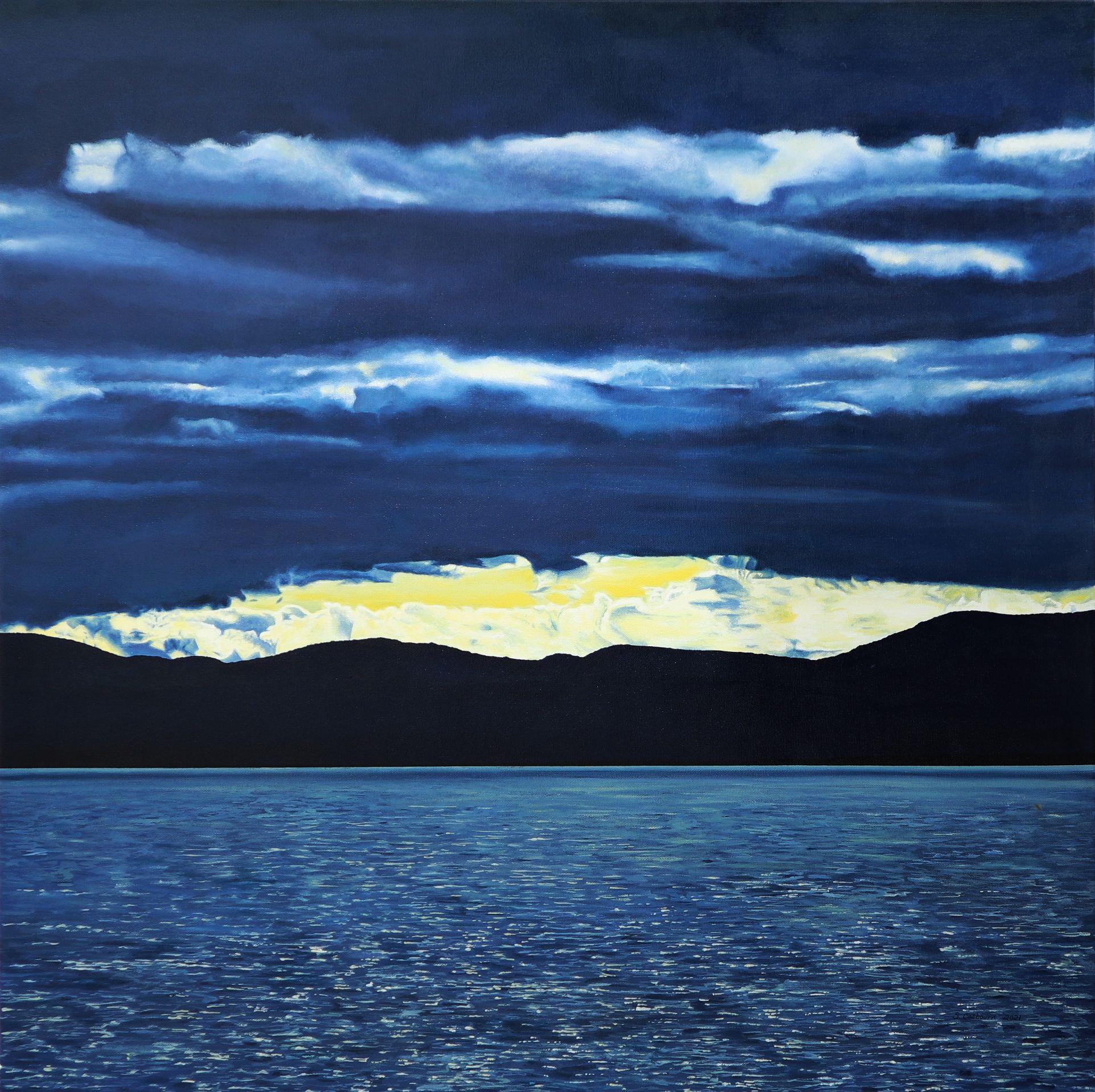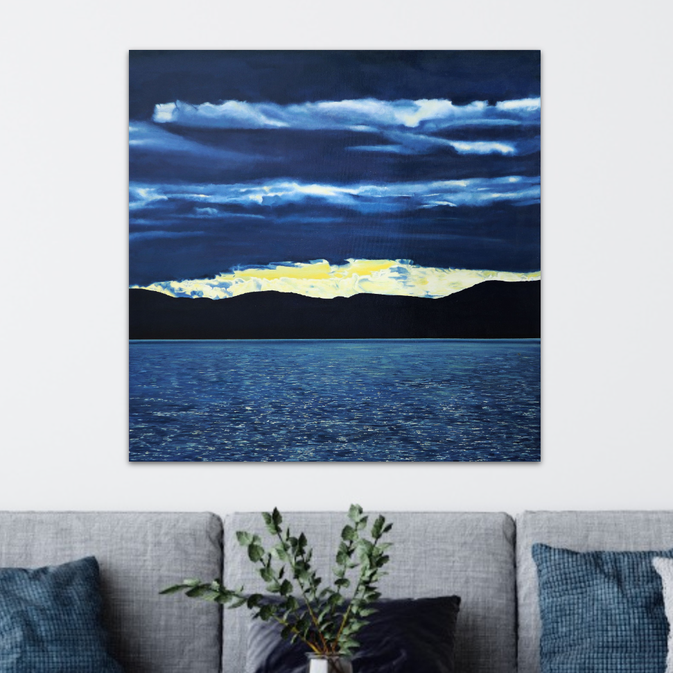 Part of a collection inspired by time spent at a family cottage on the St. Lawrence River in Québec.  The reference photo for this painting was taken during the early stages of a sunset.  Despite the heavy clouds over the river a clear band across horizon allowed the pale gold sunlight through, making the clouds look even darker by comparison.