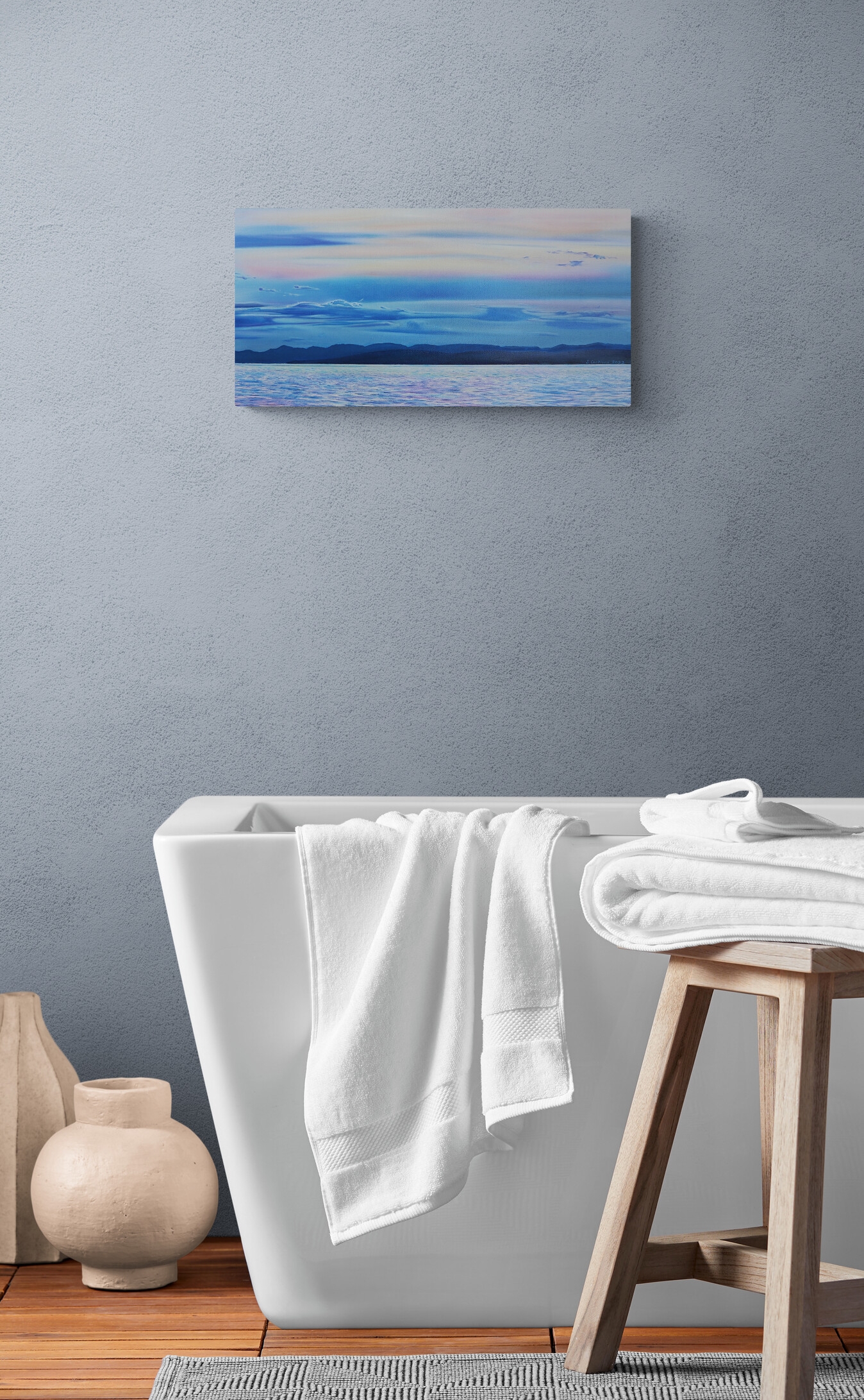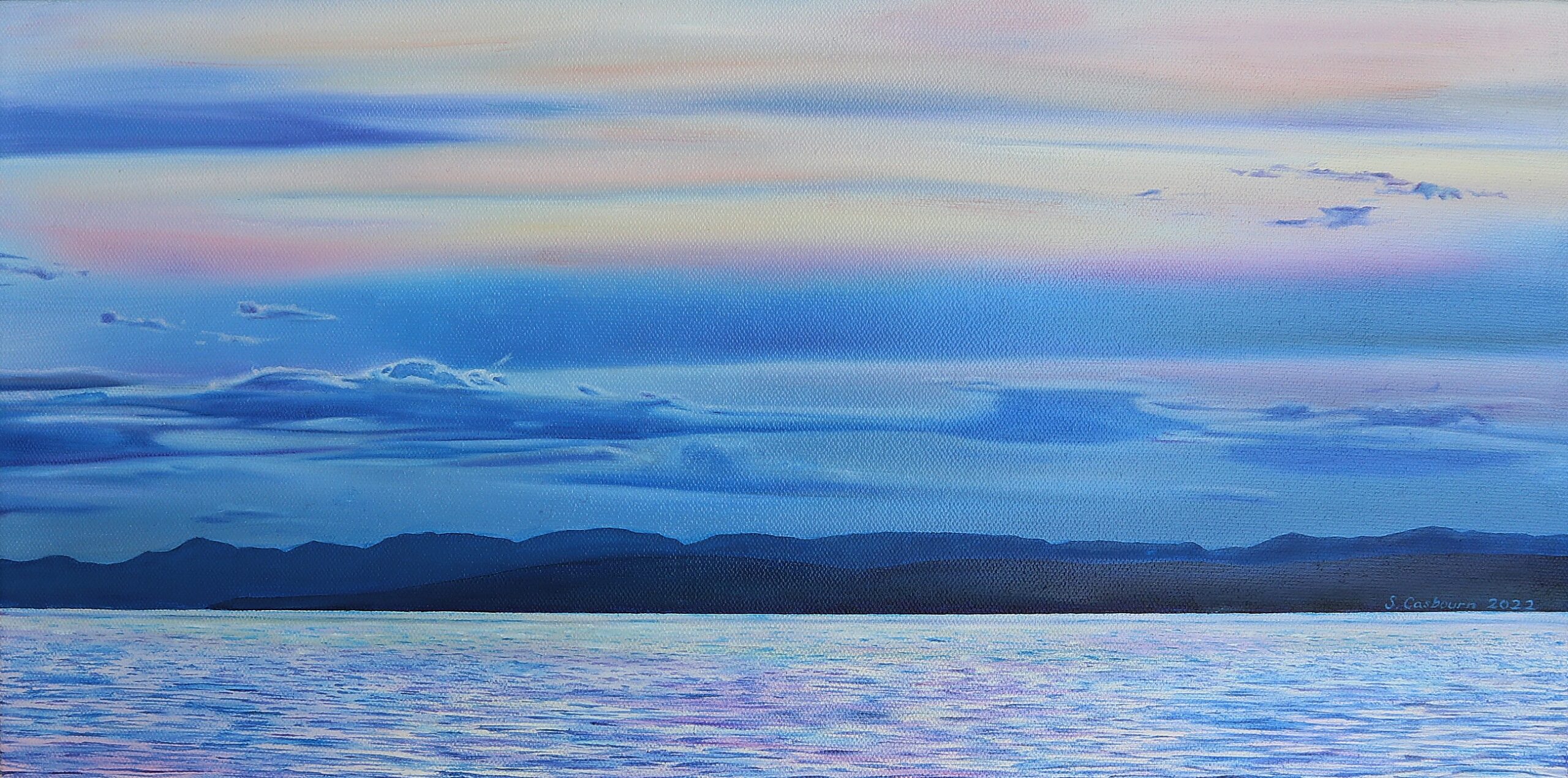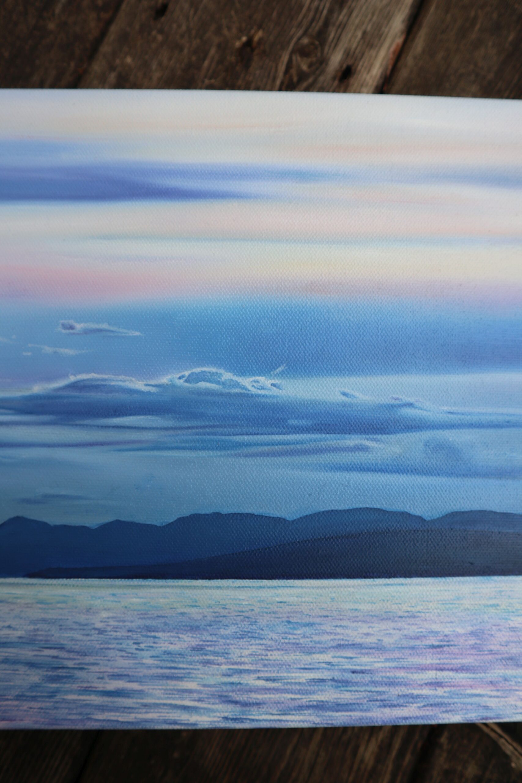 Part of a collection inspired by time spent at a family cottage on the St. Lawrence River in Québec.  This image features the thick, misty skies of an overcast day.  However there was enough sunlight coming through to create pastel tones in the upper sky and shimmering silvery waters below.