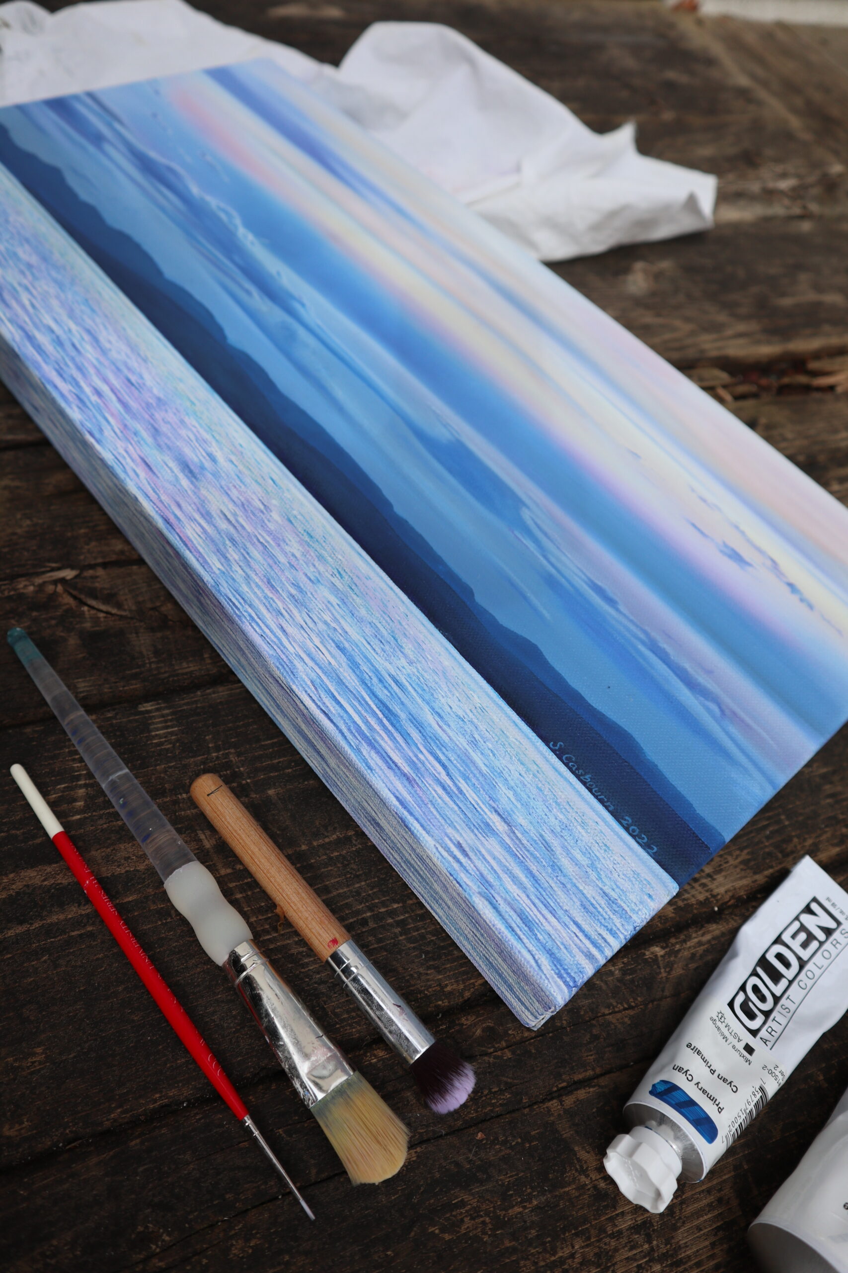 The painting wraps around the sides of the canvas for a clean and seamless finish.