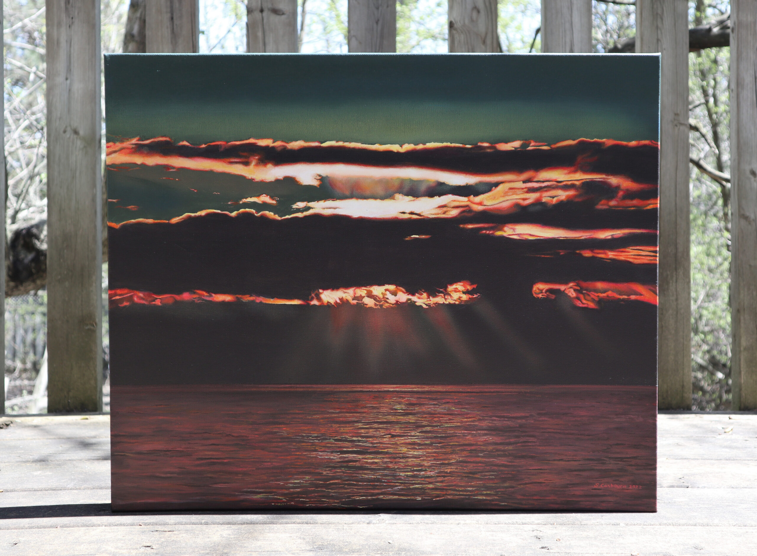 Part of a collection inspired by time spent at a family cottage on the St. Lawrence River in Québec.  I was particularly drawn to the stark contrast between the bright sunlight and dark cloud bank.  Although most of the is done in acrylic I used oil paint and a large, round, soft brush to add the beams of light radiating from the clouds.