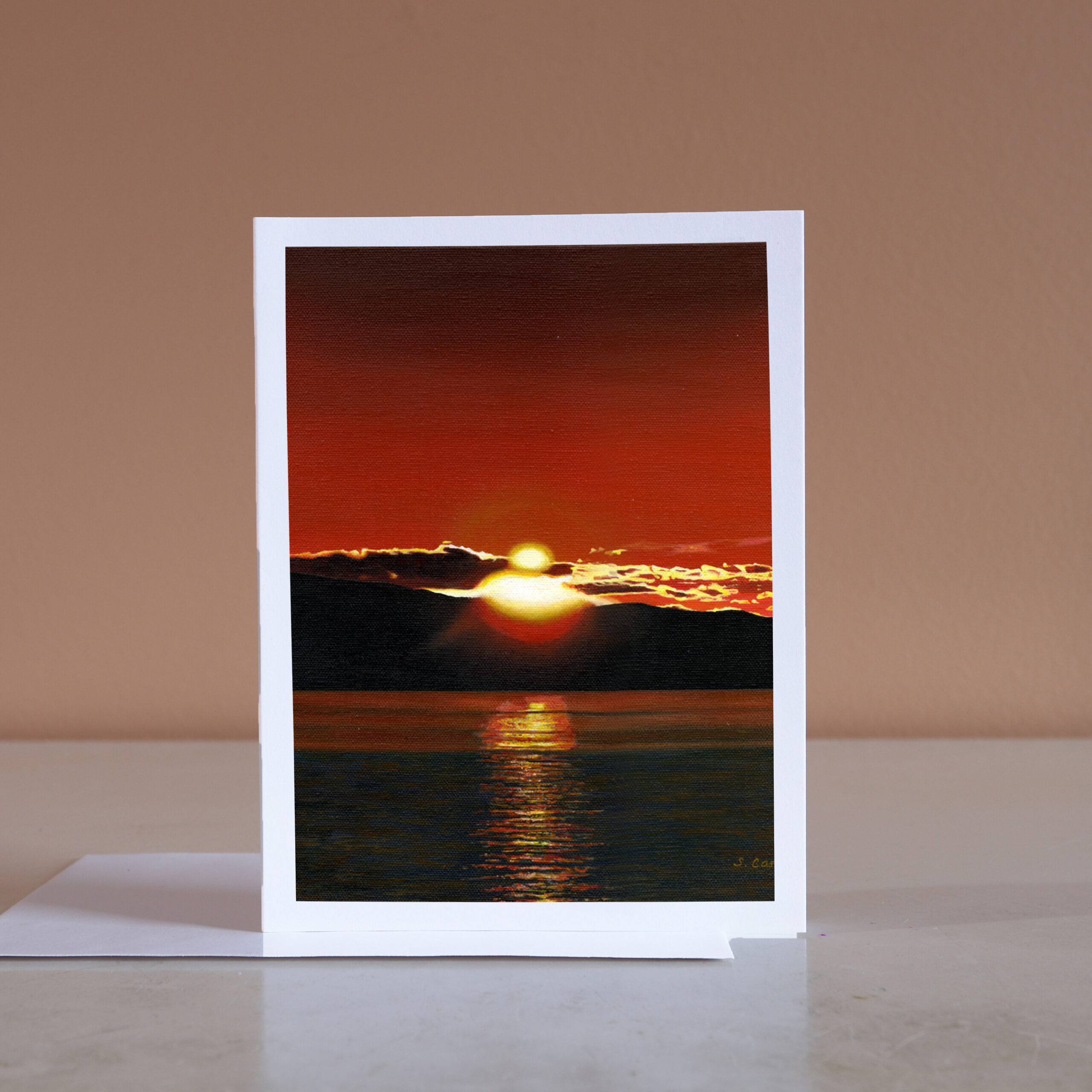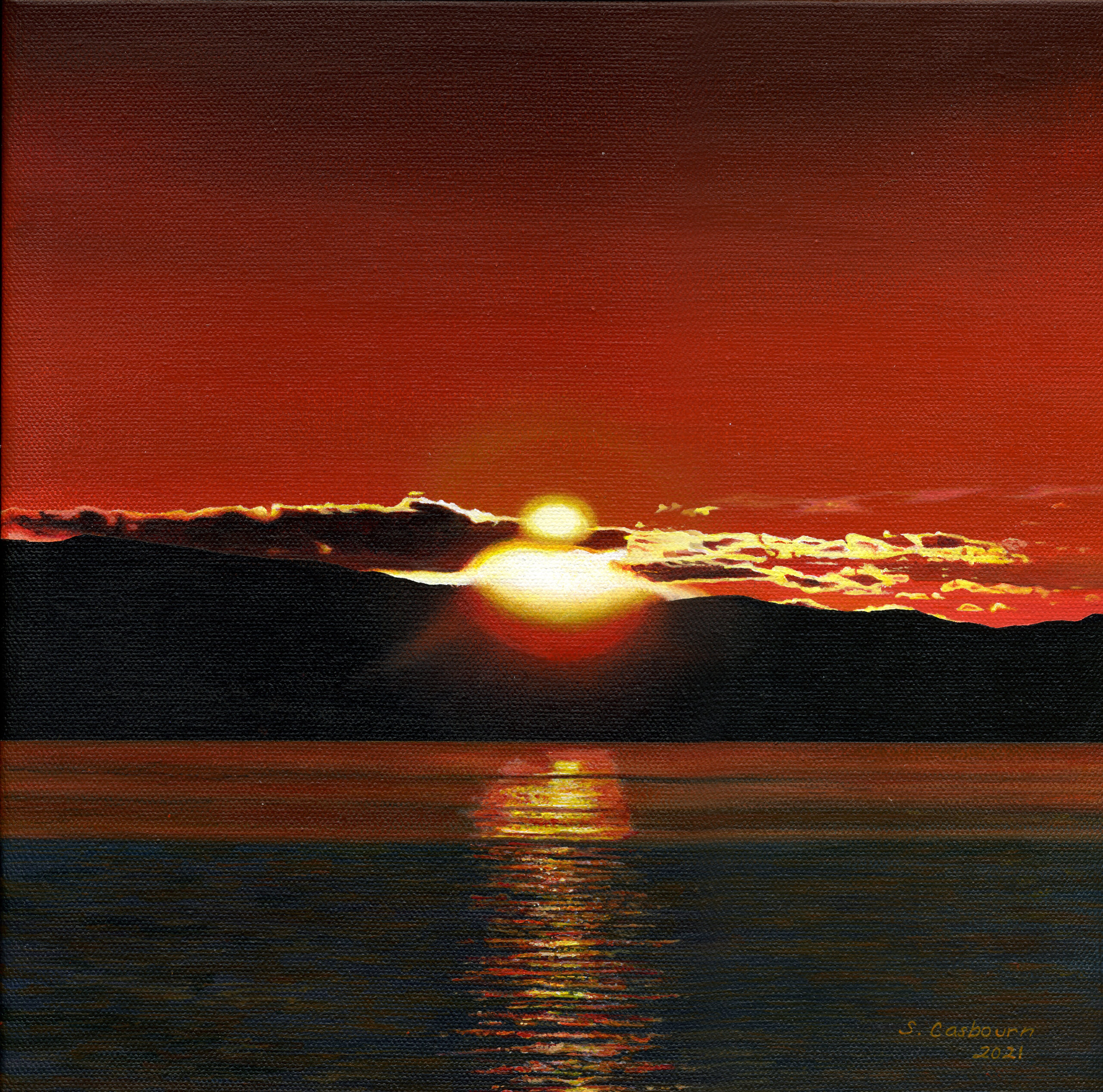 original artwork an acrylic painting of a fiery sunset over the St. Lawrence River